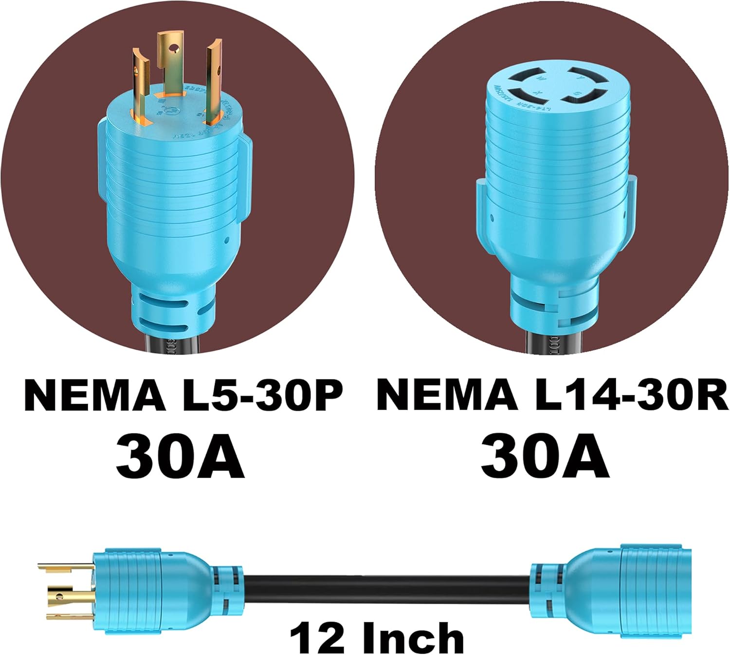 - Male: NEMA L5-30P 30 Amp 125 Volt locking plug, 12 inch