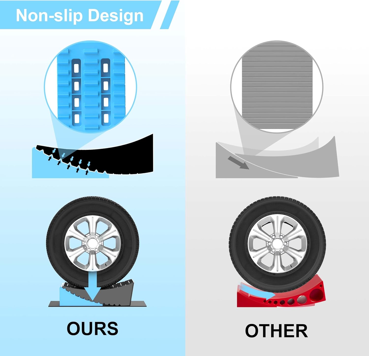 - NON-SLIP DESIGN: Our RV Levelers are equipped with a non-slip rubber pad to prevent the tire block from sliding during parking, allowing the wheel to park on the tire block more smoothly and safely. Provide you with a safer environment for use!